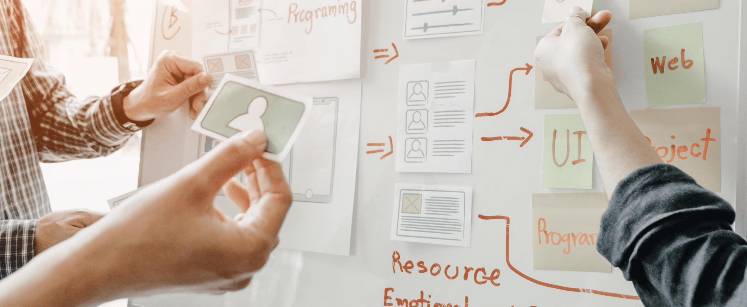Webdesigner planen Landingpages mit Wireframes und UX Notizen auf einem Whiteboard.